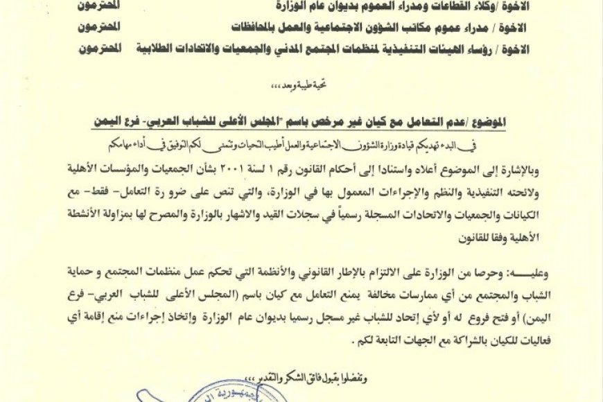 وزارة الشؤون الاجتماعية والعمل تحظر التعامل مع "المجلس الأعلى للشباب العربي فرع اليمن"