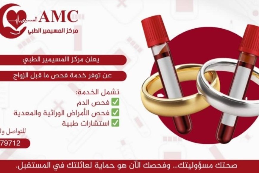 مركز المسيمير الطبي بلحج يعلن فحوصات وتحاليل مخبرية للمقبلين على الزواج...