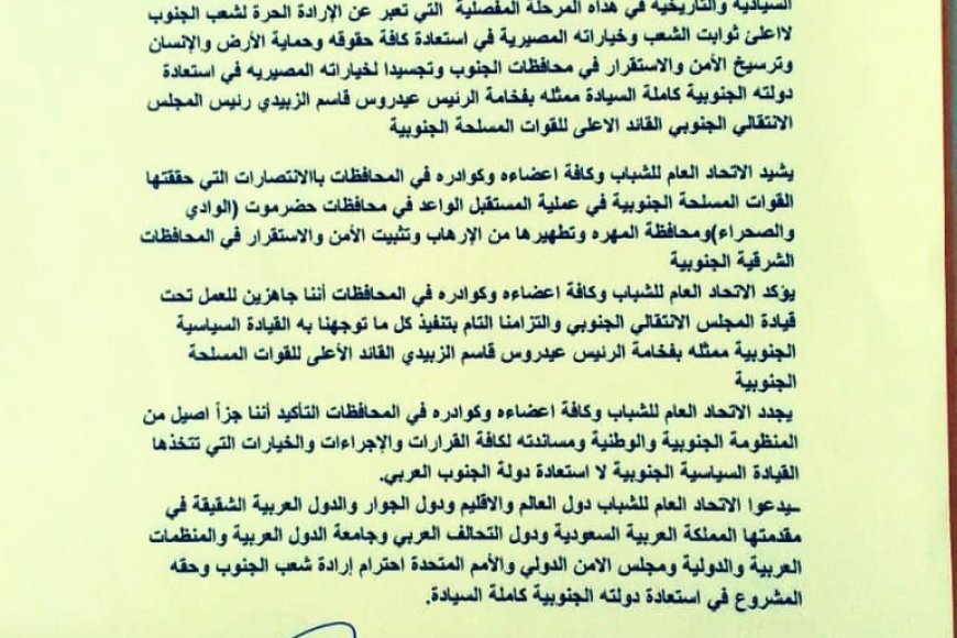 بيان صادر عن الاتحاد العام لشباب اليمن بالمحافظات المحررة يبارك خطوة إعلان دولة الجنوب العربي