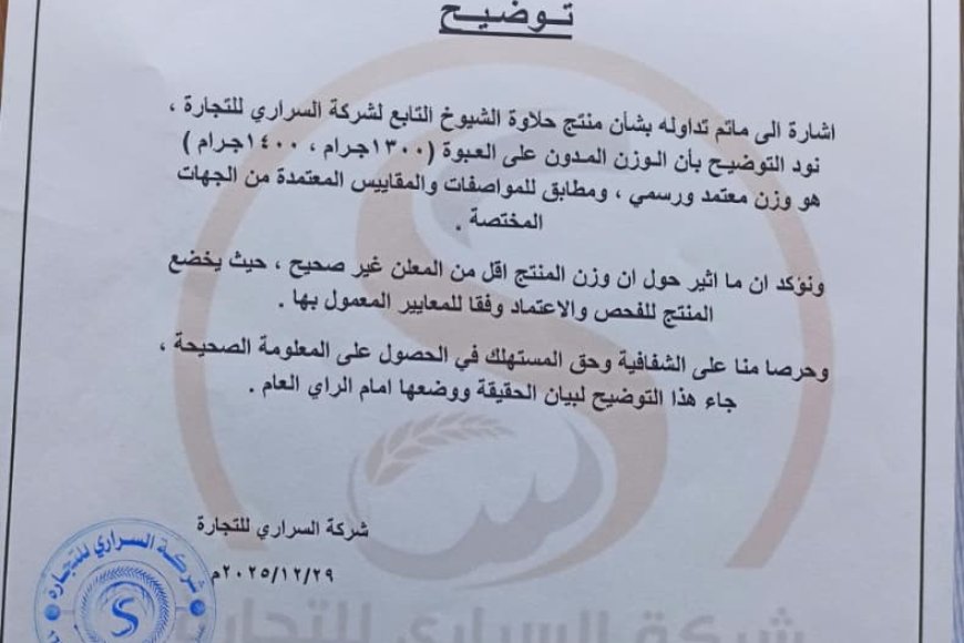 شركة السراري للتجارة توضح حقيقة ما أُثير حول وزن منتج "حلاوة الشيوخ": دقة في المواصفات وشفافية مع المستهلك