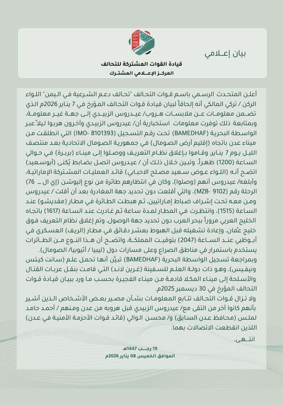 التحالف العربي: الزبيدي وآخرون هربوا بحرا من ميناء عدن الى إقليم أرض الصومال ثم نقلتهم طائرة إماراتية إلى أبوظبي