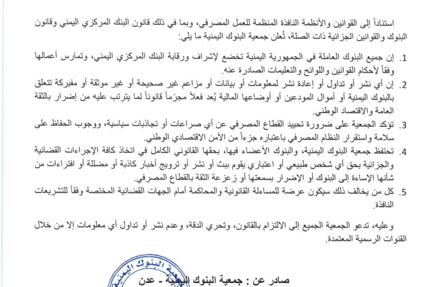 جمعية البنوك اليمنية تحذر من الزج بالقطاع المصرفي في الصراعات السياسية وتؤكد التزامها بالقانون