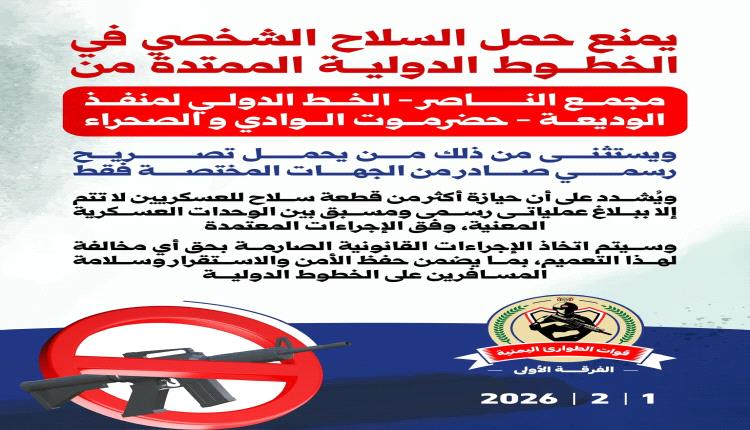 الطوارئ اليمنية تعلن حظر حمل السلاح في هذه المناطق