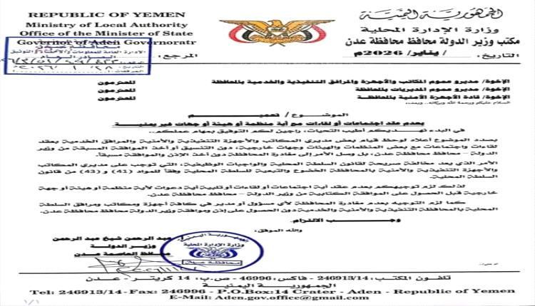 وثيقة.. توجيهات صارمة من محافظ عدن للمسؤولين من المغادرة أوالاجتماع بجهات خارجية