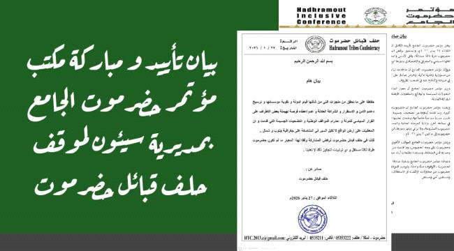 بيان تأييد و مباركة مكتب مؤتمر حضرموت الجامع بمديرية سيئون لموقف حلف قبائل حضرموت