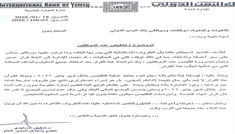 بنك اليمن الدولي يكشف عن تسريح موظفيه في صنعاء