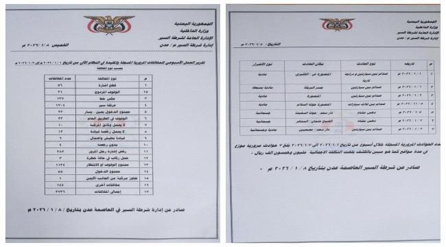 شرطة عدن تكشف حصيلة المخالفات والحوادث المرورية للأسبوع الأول من يناير